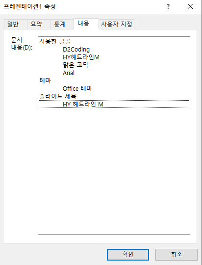 내용 탭으로 이동하면 사용한 글꼴 목록이 표시됩니다.