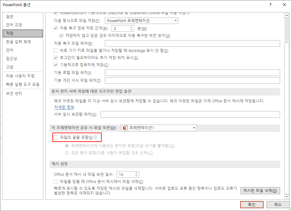 파일의 글꼴 포함을 선택한 뒤 확인 버튼을 누릅니다.